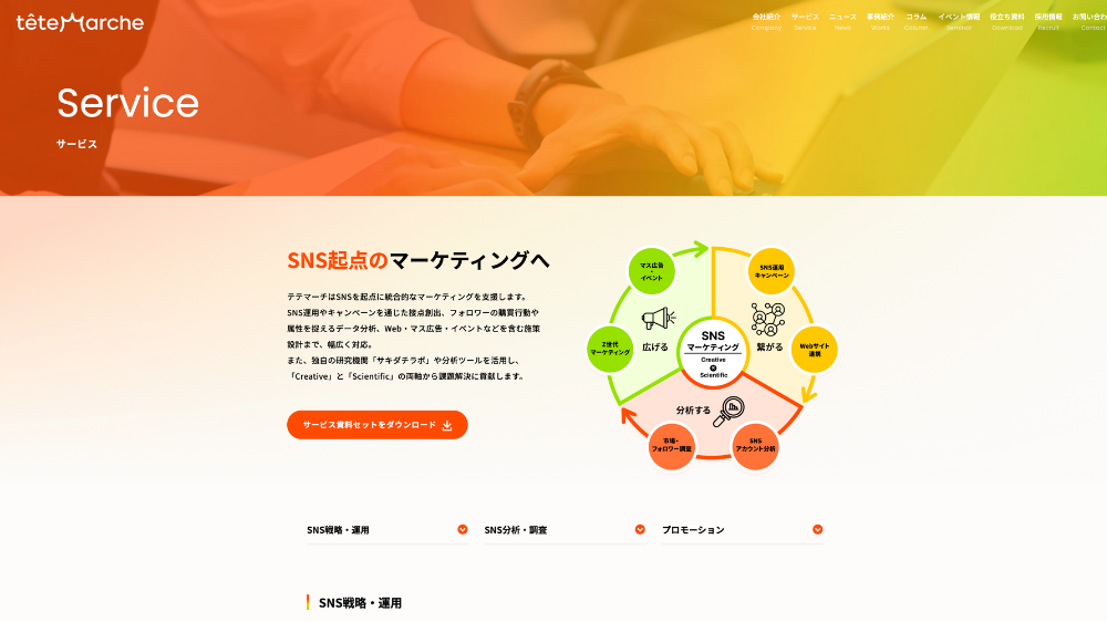 SNS運用代行や広告、マーケティングリサーチ、セミナー、イベントなど。独自のメソッドを活用した「SNSループモデル」を取り入れ、SNSと各チャネルを活用したサービスを行っているのも特徴と言えるでしょう。